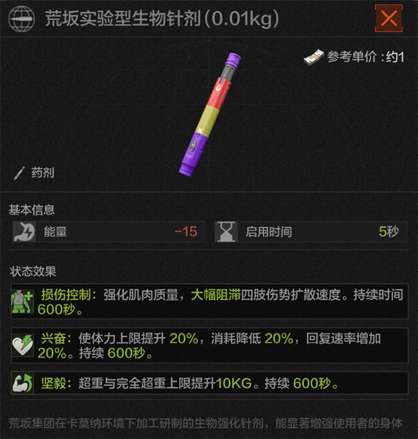 荒坂实验型生物针剂能够让边缘行者获得长时间的损伤控制、兴奋和坚毅效果。