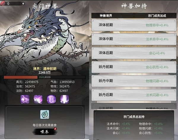 守护宗门的神兽,要经常喂养,小师妹可是每天都会去和神兽唠嗑的。神兽境界提升后,还会给宗门内众弟子们多项能力加持哦!
