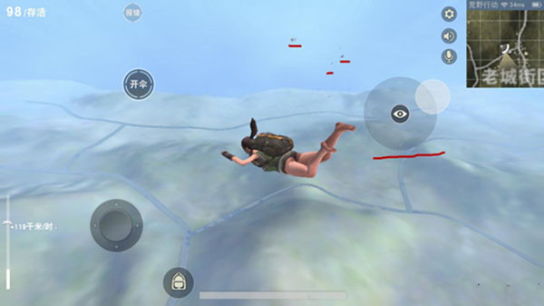 15、为了可以抢先拿到物资,到达想要跳的区域后,面朝下,拖动上方向,迅速俯冲,到一定高度后自动开伞,毕竟开伞后速度很慢,一般不会手动开伞