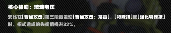 安比的主要攻击手段为前置操作快速接E/强化E,不过二测期间安比在普攻第三段后如果选择接落雷就不能继续连招。但新版为安比的接E连招新增了落雷的选择,因此在输出流程中可以先普攻第三段接落雷再接E,大幅提升了角色的可玩性和灵活程度。
