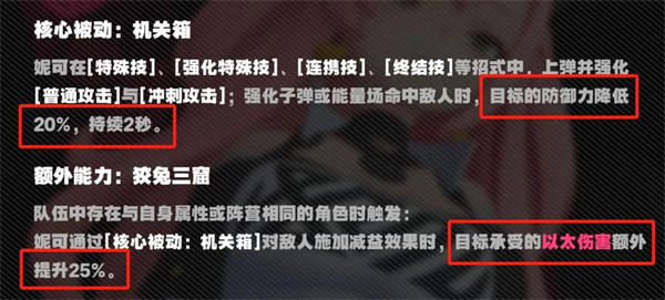 在新版中妮可的核心被动改为减防,1级核心技就拥有20%减防,经过升级后数值可观,可以灵活入队作为聚怪减防拐,大幅提高了妮可的泛用性。如果和以太主C组队,还能额外提供25%以太易伤,虽然目前暂时没有其他以太角色,但总体来看功能性已经有明显提升了。