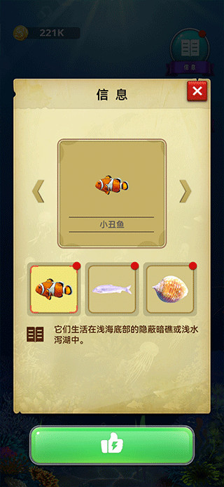 4、玩家还可以点击游戏界面上方的水族馆查看解锁鱼的信息。