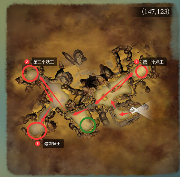 具体的打怪流程需要按照红色标识箭头进行,第一个妖王打完之后,才会开启进入第二个妖王的路,打败第二个妖王之后才可挑战最终妖王。
