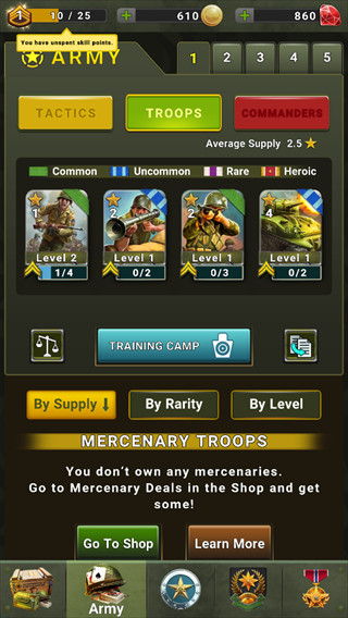 每套牌中玩家最多可以拥有 8 个战术和 4 个部队。要装备一张卡牌,你必须从“陆军”选项卡中的“可用战术”或“预备部队”部分中选择它,然后按“使用”并选择一张你想要替换的卡牌,或者如果你碰巧有的话,选择你牌组中的空白区域一。要了解每个级别的最佳卡组是什么,请单击此处。