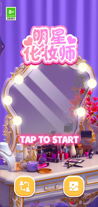 1、打开明星化妆师游戏,点击左边方块可以选择将要化妆改造的人物,右边方块是相册,化完妆以后拍的照片会在这里显示,点击“TAP TO START”开始。