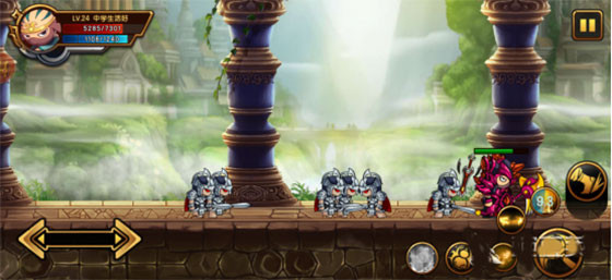 游戏的操作不同于电脑端的造梦西游系列,新的操作模式更加符合移动设备的特点。在游戏界面,采用的是全屏触摸操作模式,点哪就走到哪,十分便捷。而在战斗中,采用的是虚拟按键的操作模式,屏幕的左下角是左右移动按键,右下角则是普通攻击、跳跃和技能按键等,这样的设计十分合理,不会太占用宝贵的战斗画面。
