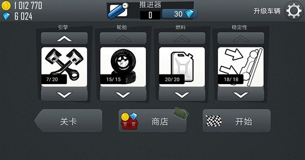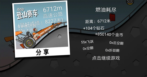 3、勇敢尝试高超技巧可获得额外奖金,比如飞跃,空中停留的时间越长分越高,前空翻或者后空翻,还有丧心病狂的折颈翻,用生命作为代价赚取的分数……收集金币可以购买新车、开新关卡,升级部件并到达更高距离。游戏难度会根据开出去的距离升级。