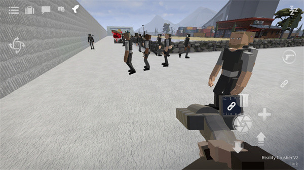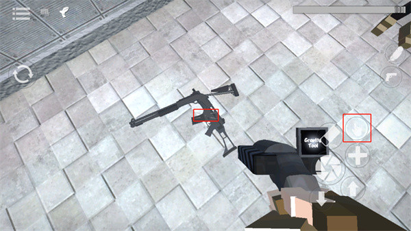 1、打开g沙盒仇恨最新版,想要拿枪就必须先找到一把枪,找到枪后需要将准心放到枪上,这时屏幕左边会出现一个手指按钮,按住手指按钮即可拾取;