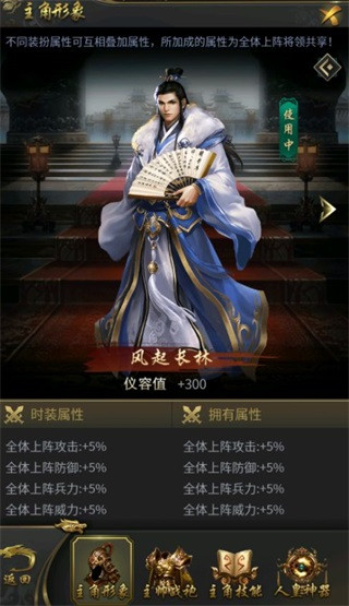 1、主公大人可以在主界面点击“主公”雕像进入主角界面,可以对主角的形象进行更换,主角形象可以通过晋级爵位、购买vip礼包、榜单奖励等多种方式获取,稀有的主角形象可以为主公提供各类属性加成