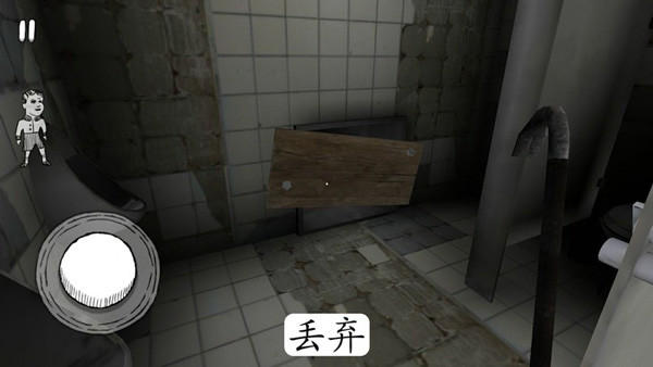3、在屏幕右下角的是控制角色移动的操控摇杆,在他上方的小人是控制角色蹲起的,在屏幕的正中间你会看到一个小白点,它是用来通过滑动屏幕来控制拿道具或者开门等操作的。当这个小白点停留在可以拿起的道具上时屏幕右侧会出现一个白手,点击后就可以拿起来了,当拿起物品后屏幕下方会出现丢弃的图标,当不想用这个物品的时候点击丢弃就可以了,再切换新的物品时拿在手里的旧物品会自动丢在地上。