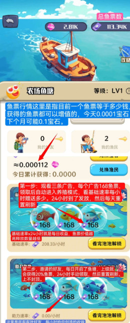 2、助力鱼塘:点击三条广告开启,当下级好友完成每日广告,赠送20%鱼票给上级,上不封顶。例:下级好友1000人,则每日赠送:1000人*基础速率20%*24小时=100万,24小时后重新激活。