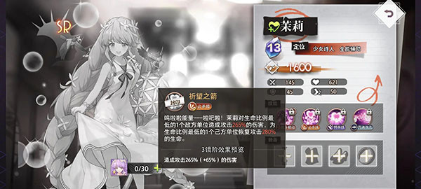 2、茉莉作为治疗角色,奶妈乃是队伍必不可少的位置,可以看到茉莉的卡组技能激活相当简单,正是出战小夜,完美配合,效果也不错,茉莉每次行动都能及时的奶到我们血量最危急的伙伴,大大加强了存活能力,同时上场就能给我方伙伴加攻,非常出色的被动。茉莉大招也是非常不错的,锁定对方血量最低的角色,可以作为刺客使用,有奇效,同时奶我方血量最低的角色,保证不会奶不到想奶的目标,非常优秀的奶妈。