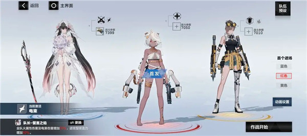 4、前期物理队(凛冽单c):亚里莎·回音(蓝位,队长),七实·风暴(红位,首发),罗塞塔·凛冽(黄位)