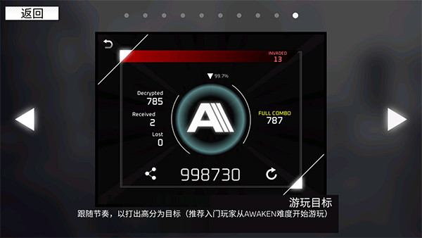 跟随节奏,以打出高分为目标(推荐入门玩家从AWAKEN难度开始游玩)。
