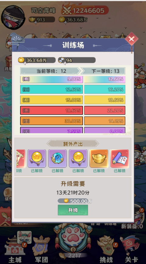 升级训练场是游戏的基础玩法的核心,用于获取更高阶的装备,所以尽量先升级训练场。可以通过“减少时间”(每30分钟一次,一次减少30分钟的升级等待时间)和沙漏加速升级。