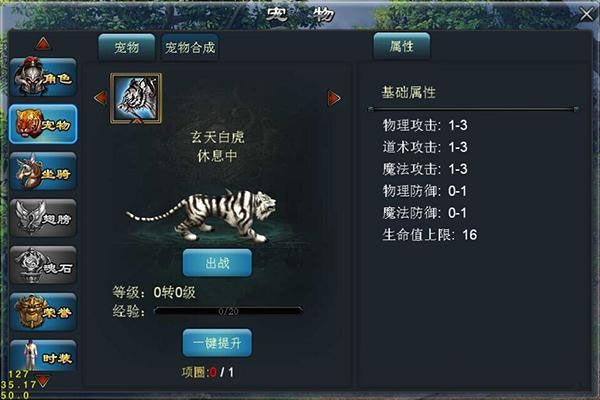 角色跟随任务到达10级后,可以免费获得一只宠物!宠物可以帮忙拾取物品,还能加属性!随时随地都有个小伙伴相随的幸福感觉有木有!宠物可通过宠物项圈进行培养升级,获得更新属性,宠物达到200级后,可以合成,获得更高属性。宠物项圈可通过各种福利、日常任务、日常副本获得,每天都可以升!