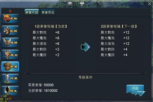 人物到达56级后,开放荣誉系统,荣誉可以增加人物属性最大值,升级需要消耗一定量的荣誉点,荣誉点可以通过城主膜拜、日常任务及VIP福利获得,也可以在商城购买荣誉符,使用获得。
