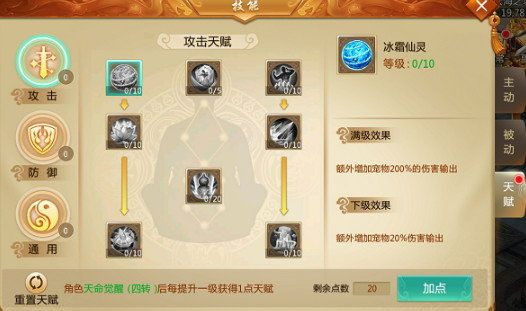 角色天命觉醒(四转)后立即获得10点天赋点数,此后每提升一级角色等级获得1点天赋。