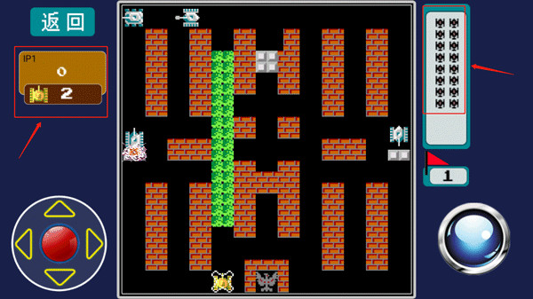 3、地图中分布了很多坦克,而你需要保护你的老鹰不被攻击的同时并将这些坦克消灭掉,敌方坦克和你都有几次重生的机会,左边自己坦克的生命系次数,右边白色框框内为敌方坦克生命次数,没消灭一个坦克框内就会减少以此机会。