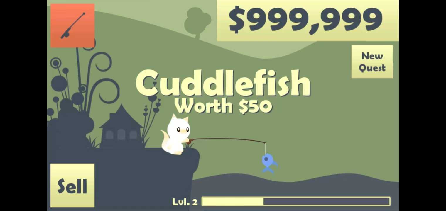 2、钓到鱼后,长按手机屏幕,就可以把鱼钓上来,钓到鱼的话则会获得大量金币,点击左下角的【sell】出售可获得金币;