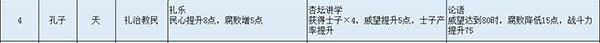技能3(论语):威望达到80时,腐败降低15点,战斗力提升75。