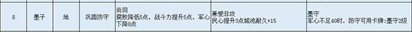 技能3(墨守):军心不足40时,防守可用卡牌:墨守2级。