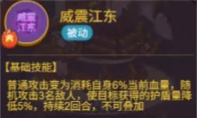 普攻是随机打3,消耗当前血量的6%,降低受攻击武将的护盾获得量10%,且是不可叠加的。所以这个技能只能说是中规中矩,减盾效果不如碎盾。
