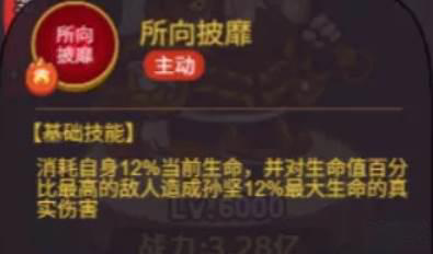 消耗当前12%的生命(注意,这里是当前生命的12%,不是最大生命的12%)。对敌方单体造成孙坚最大生命值12%(最大生命值越高,伤害倍率越高,最高可以增加15%,也就是12%+15%=27%)的真伤。