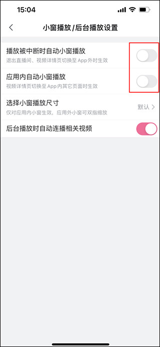 5、最后进入到小窗播放后台播放设置页面,把“播放被中断时自动小窗播放”和“应用内自动小窗播放”两个选项右侧的开关按钮关闭即可。