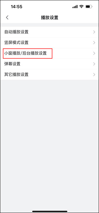 4、来到播放设置页面,再点击页面上方的“小窗播放后台播放设置”选项;