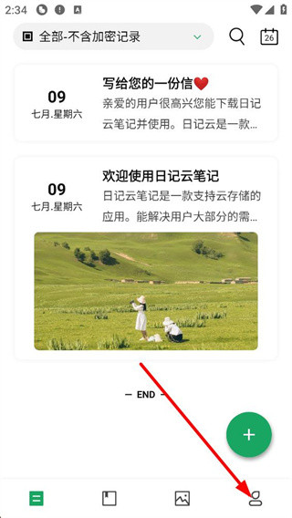 1、进入日记云笔记主界面,显示已有的笔记内容,顶部可筛选记录类型,点击底部我的选项,进入个人功能页面。