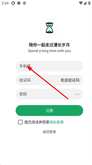 4、进入注册页面,需依次填写手机号、获取并输入验证码、设置密码,勾选同意隐私政策后,点击注册按钮完成账号注册操作。