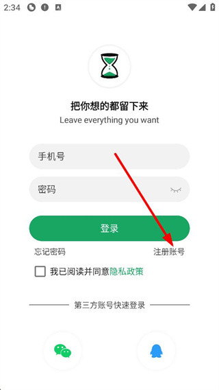 3、进入登录界面,支持手机号密码登录,也可选择注册账号进入账号注册页面,同时提供微信、QQ等第三方账号快速登录方式。