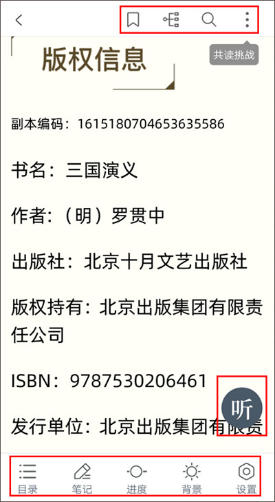 ●正下方横排图标分别为[目录] [笔记][进度] [背景] [设置],点击各按键可进行相应的功能操作。