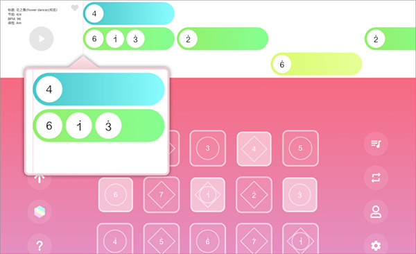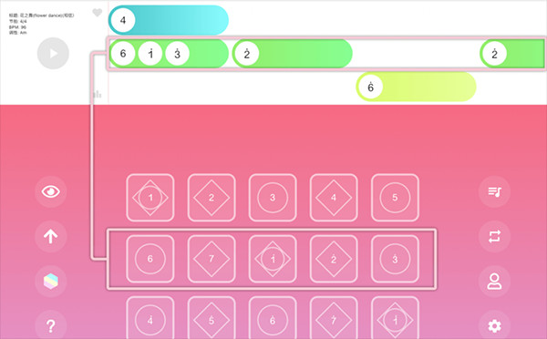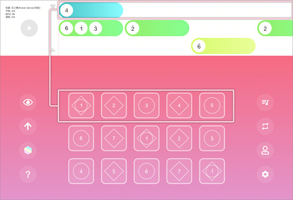 3、点击歌曲标题稍等片刻乐谱将加载到练习界面,乐谱分为三行,第一行对应键盘的第一行按钮。