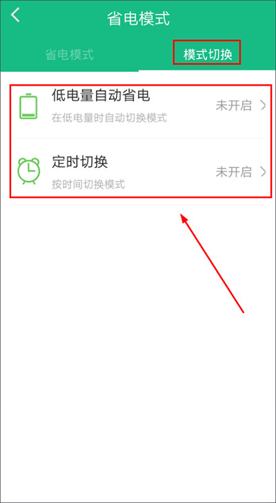 3、点击【模式切换】,这里是自动设置:用户可设置低电量自动开启省电模式,或是定时开启省电模式,这样更方便用户能长时间使用手机