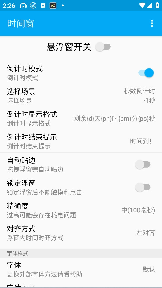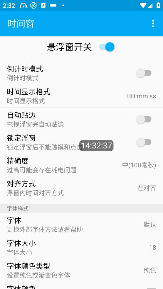 时间窗是一款实用的系统工具类时间悬浮窗软件。时间窗官方最新版能够把时间悬浮在手机屏幕上显示,操作简单,无论用户在全屏内的哪种情况下玩手机,用户都能及时了解时间。除此之外,时间窗软件界面清爽简洁,功能强大易用,体积十分小巧,几乎不占用内存。并且时间窗官方最新版还提供多种自定义模式,支持设定悬浮窗的大小、样式、位置、透明度、圆角、颜色等参数调整,让你做个有个性的时间浮窗。感兴趣的用户赶紧来下载吧!