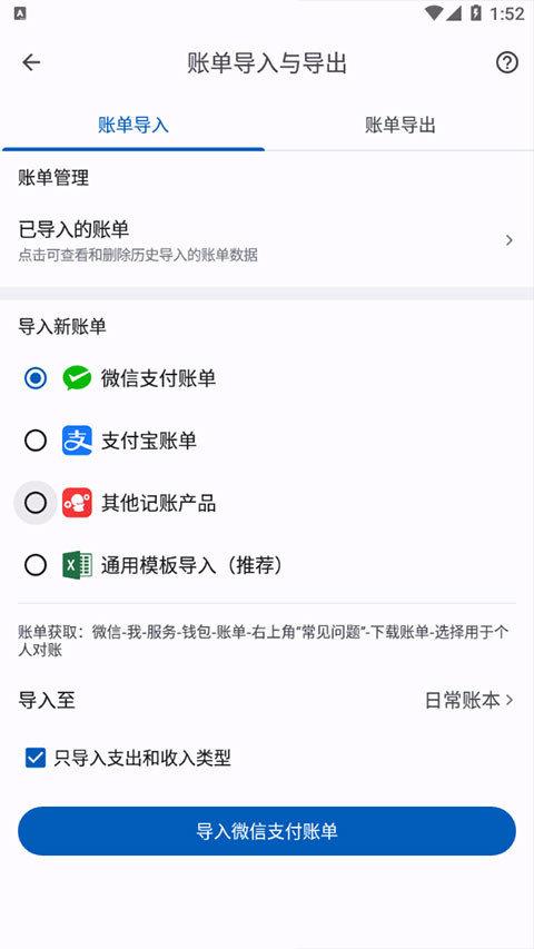 2、然后选择新账单进行导入,也可以导入本地的EXCEL账单。