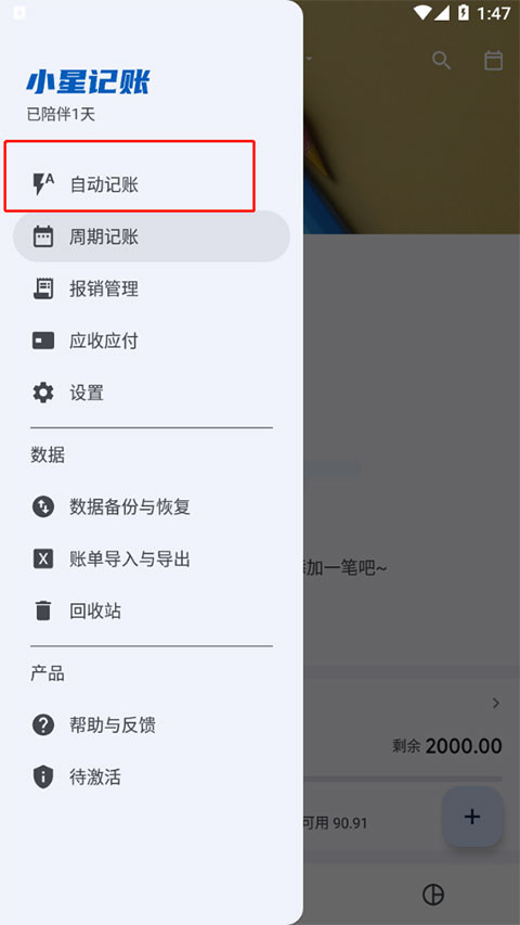 1、打开小星记账ai自动记账软件,点击左上角的设置功能选项,然后选择“自动记账”功能。