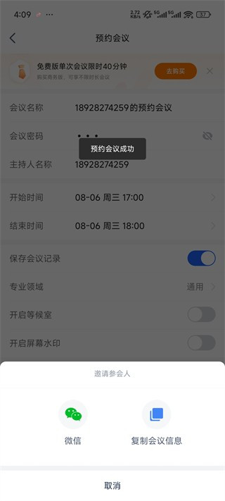 第二步:点击【立即预约】,弹窗提示”预约成功同时生成“邀请链接”