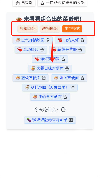 3、而所生成的菜谱也分为模糊、严格、生存三个模式。