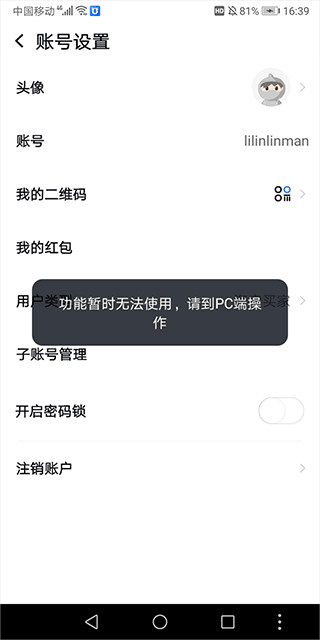 4、如有提示该功能暂时不能使用,可到pc端进行操作