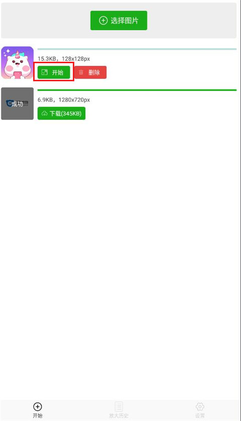 2、选择好图片后,图片就会出现在列表里,点击开始按钮。