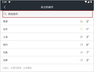 在搜索城市后,选中的城市会自动成为你的关注城市。