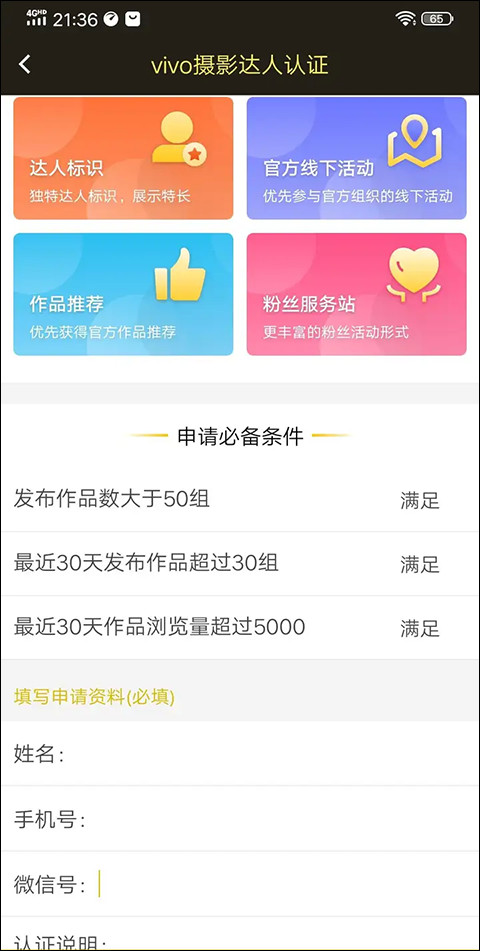 2、提交申请:在APP内找到达人认证的入口,按照提示提交申请,并上传相关的佐证资料(如其他摄影平台的认证或摄影比赛的奖项等)。