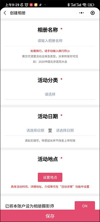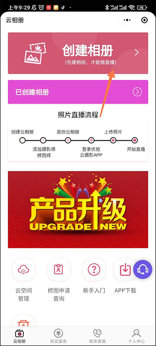 2、这样我们就进入优拍云摄影的微信小程序了,这个时候我们登陆好账号后点击创建相册。