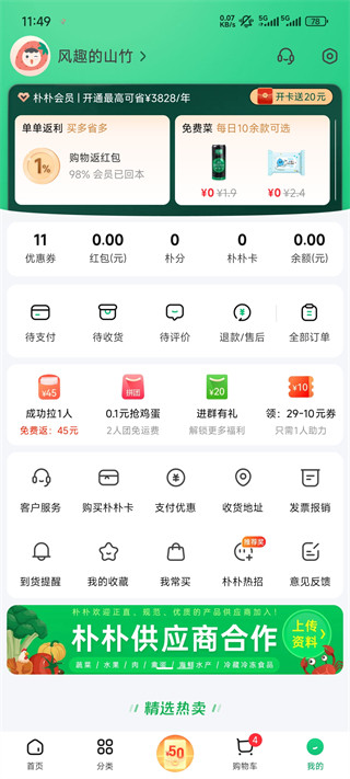 5、朴朴买菜App内还有各种福利【0.1元抢鸡蛋、拉人免费返45等等】