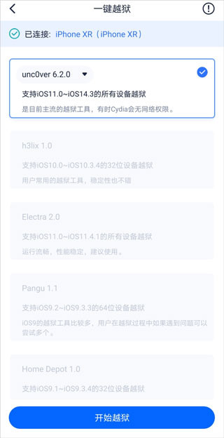 若有当前 iPhone 支持的越狱工具,会在应用界面中自动显示,勾选后点击“开始越狱”并耐心等待越狱工具安装,安装完毕即可在 iPhone 上打开越狱工具运行。