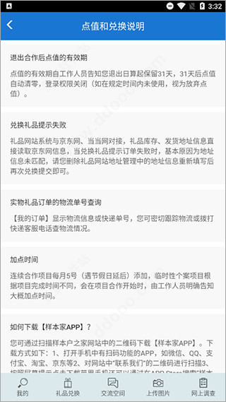 2、五大专栏覆盖积分查询、礼品兑换、参与调查、上传图片及交流留言,功能一目了然。