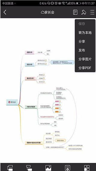 2、如果你想将已经保存在个人云里的导图保存至手机本地,可以在编辑界面点击右上角的工具按钮,选择“转为本地”,就可以将文件转存到手机本地存储空间里了。